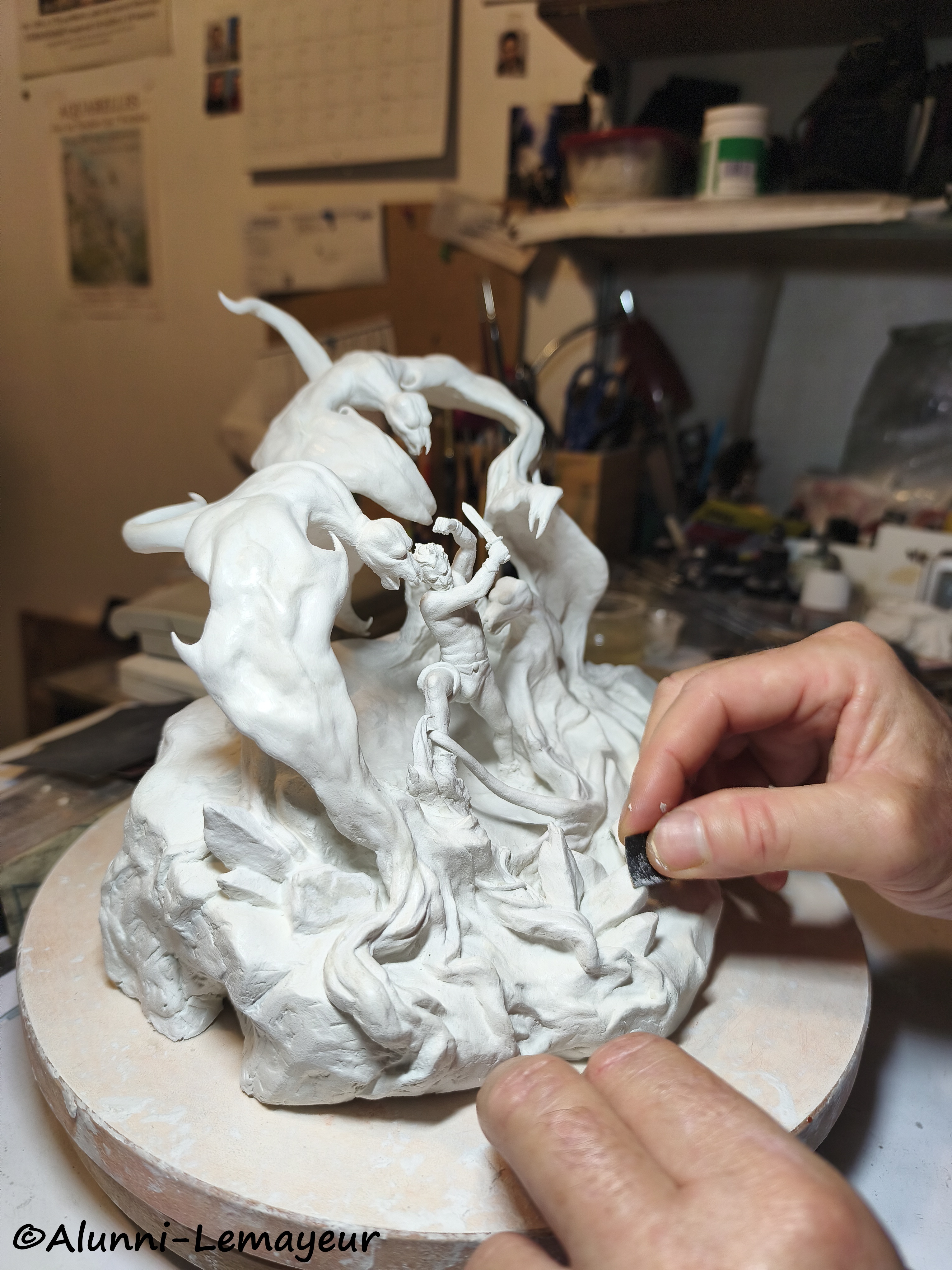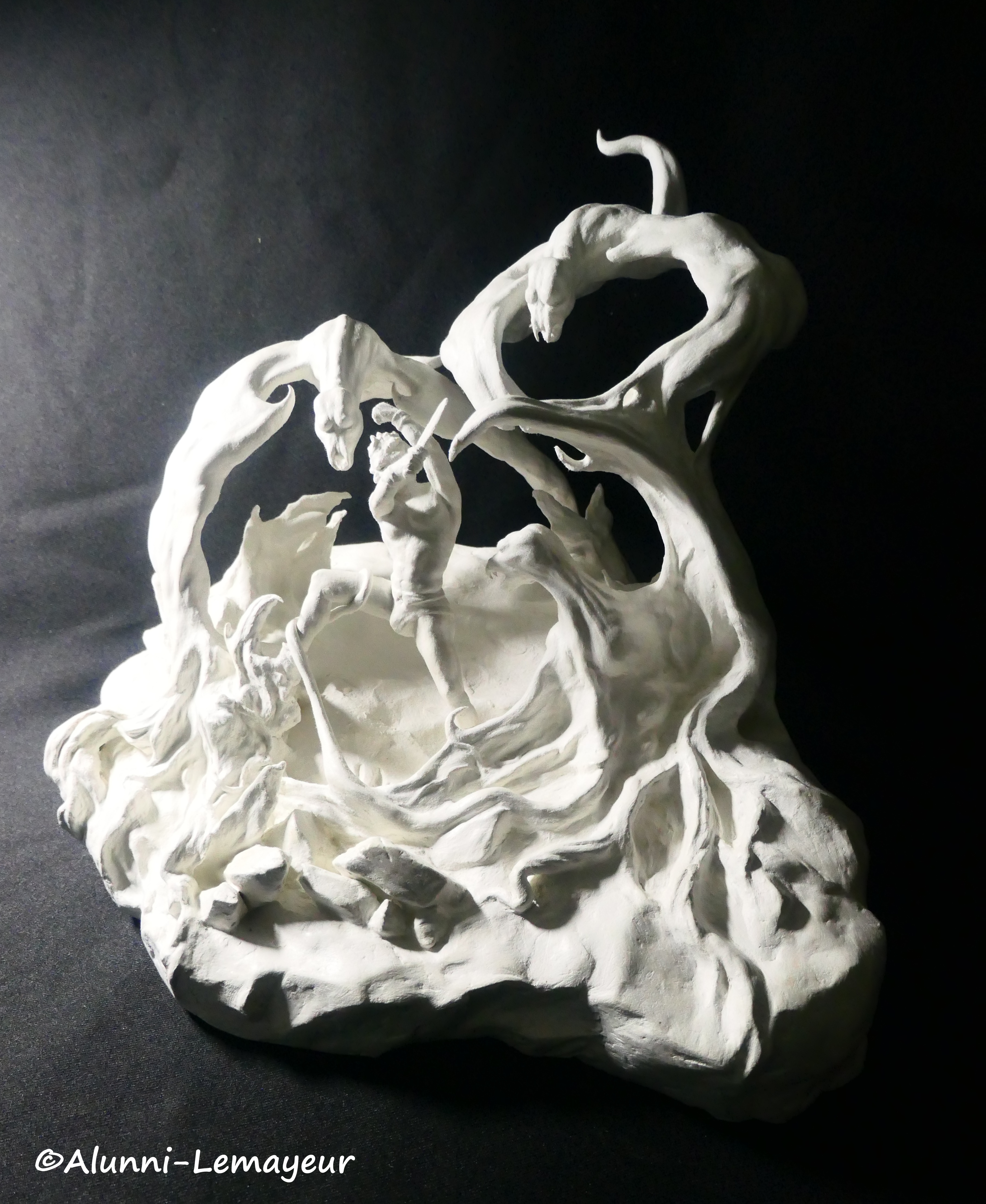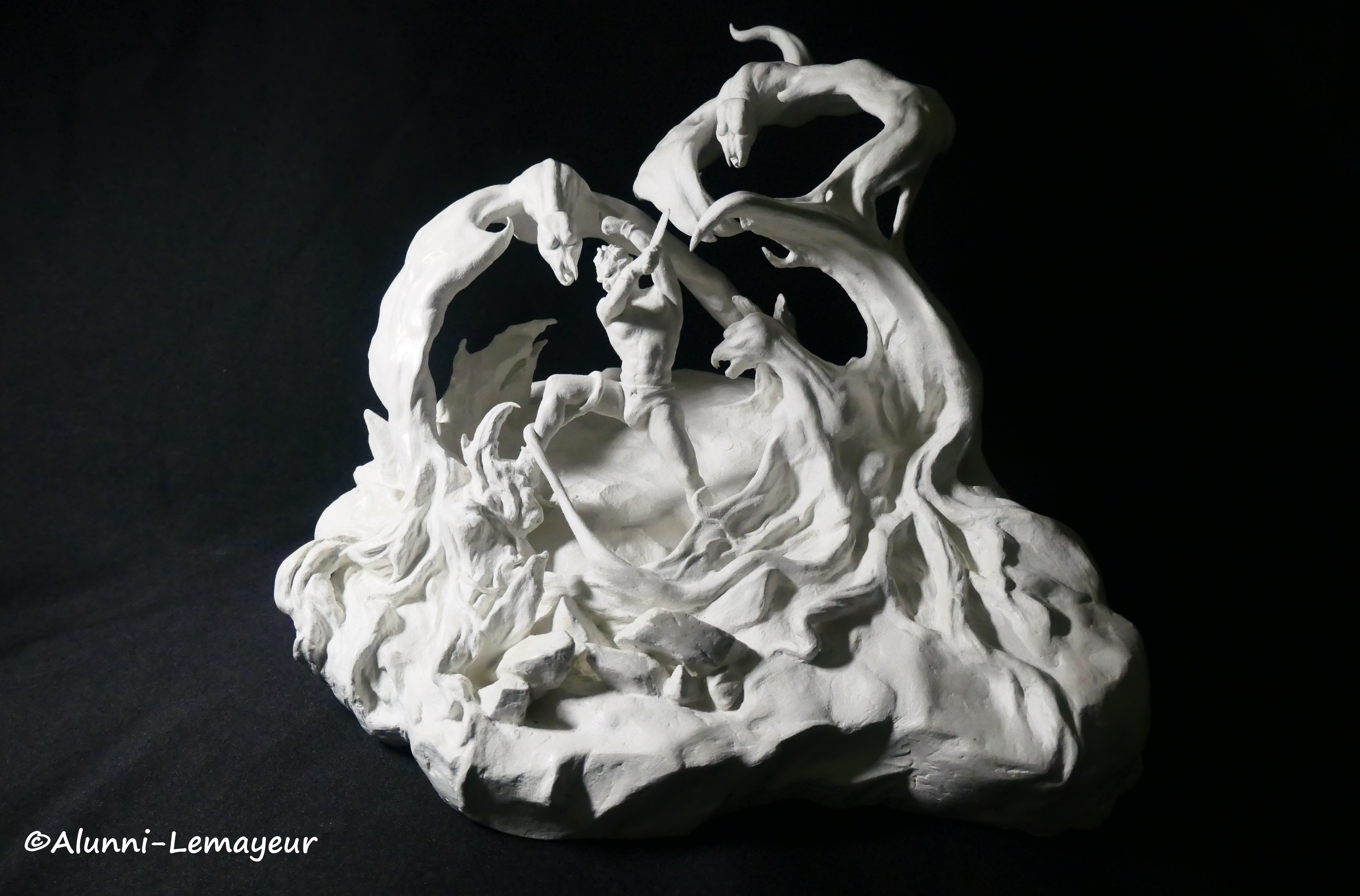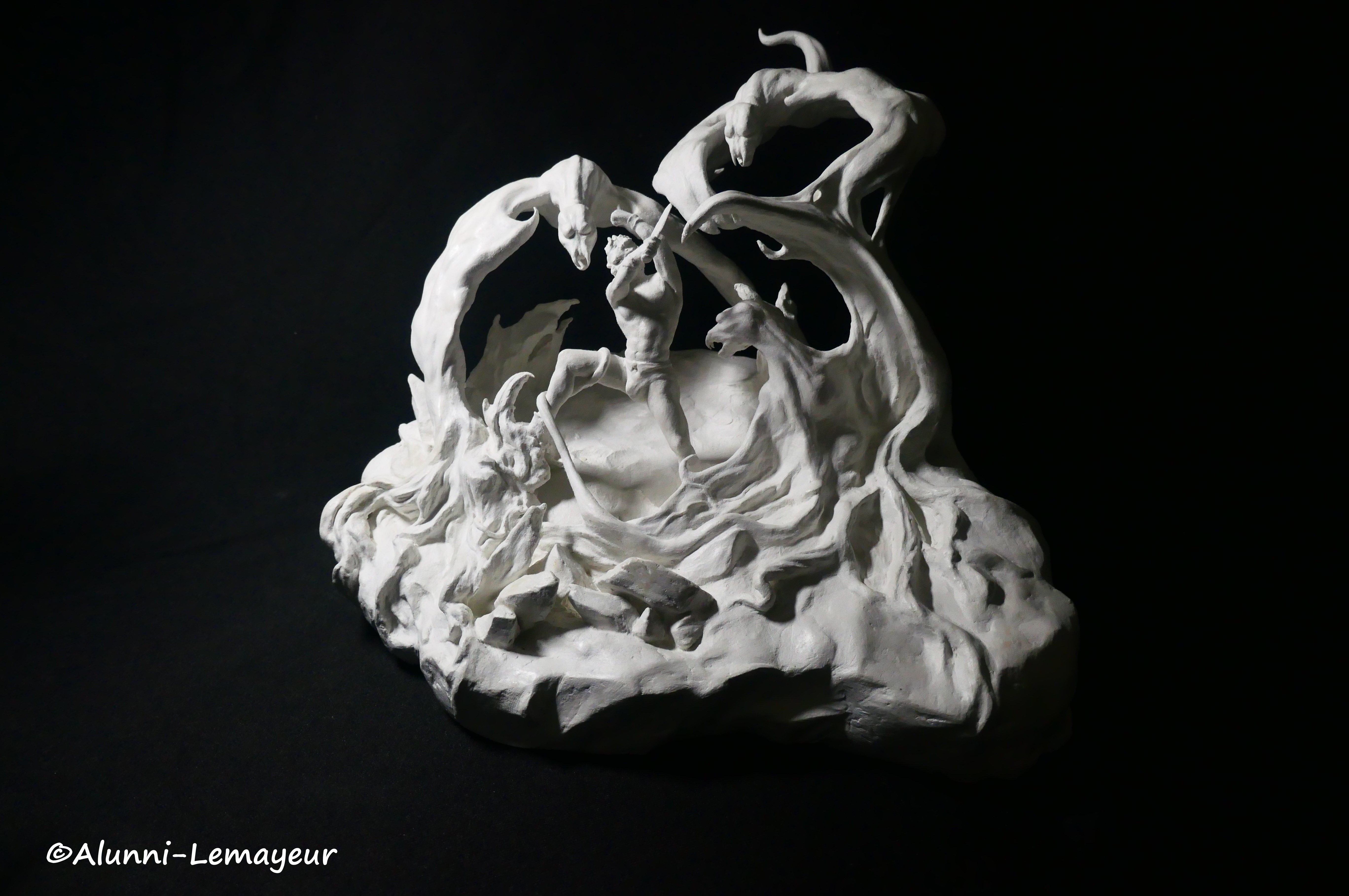 Là c’est « Terreur ailée », interprétation personnelle en argile © Plastiroc de la peinture éponyme de l’artiste-peintre et illustrateur américain Franck Frazetta (1928-2010). Mondialement connu pour ses œuvres SF et Heroic Fantasy, c’est un artiste que Bernard adore et qui l’inspire beaucoup, tant pour la sensualité exacerbée de ses créatures féminines que pour la puissance et l’imaginaire de ses œuvres.